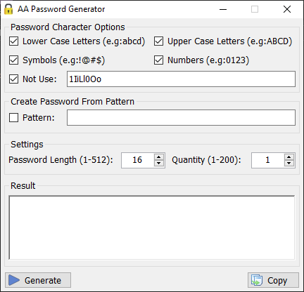 This portable program can generate random passwords using anything from lowercase to capital letters, digits and symbols or by following patterns.